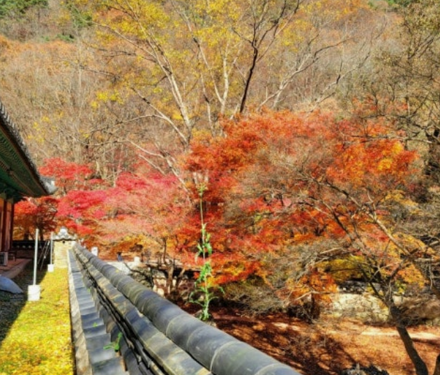 사찰 경내와 어우러진 단풍길이 고즈넉해