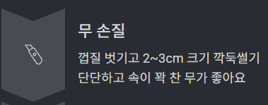 | 무 끝단 | 아린 맛 있으니 조림·장아찌 추천 |