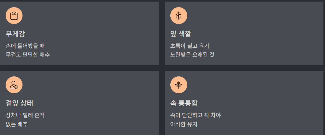 | 겉잎 상태 | 상처나 벌레 흔적 없는 배추 |