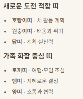 | 원숭이띠 | 변화와 기회 | 새로운 배움·취미 추천 |