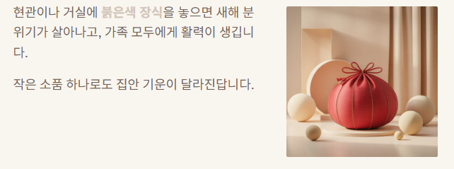 - 활용 팁: 붉은색 소품, 집안 장식, 가방 등으로 새해 분위기 살리기