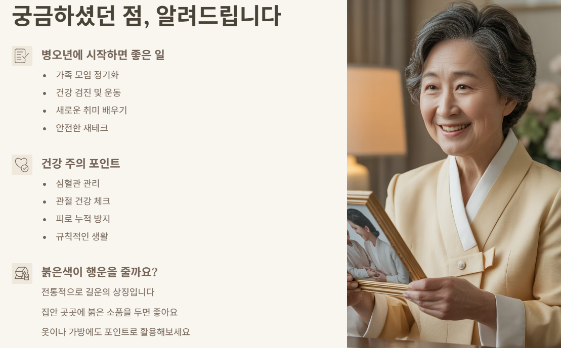 여기서는 병오년의 전통적 의미, 띠별 운세, 건강과 재테크 전략, 가족 계획까지