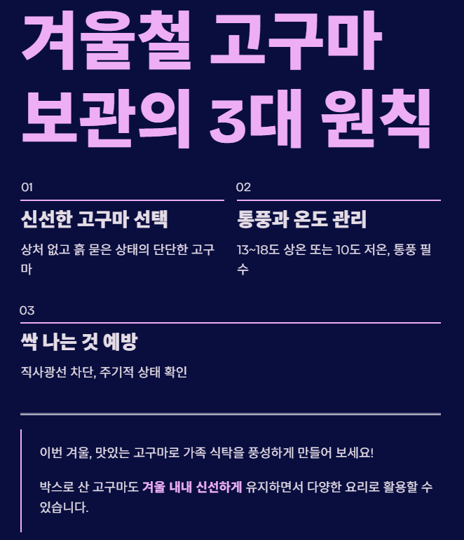 신선한 고구마 선택 → 통풍과 온도 관리 → 싹 예방 3가지 원칙을 지키는 것이 핵심입니다.