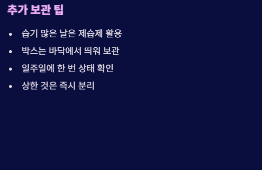- 중장기(2~3개월): 저온 보관 + 종이봉투 포장 + 통풍이 잘되는 박스