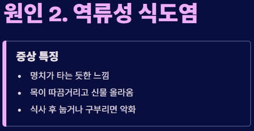 위산이 식도로 역류하면서 명치 부근이 콕콕 아프거나 타는 듯한 느낌이 나타납니다.