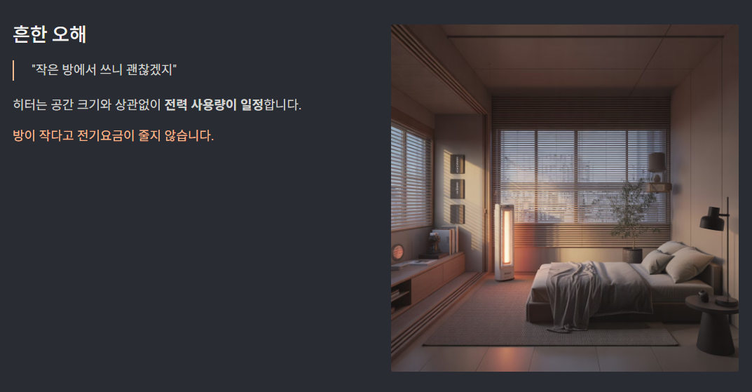많은 분들이 “작은 방에서 쓰니 괜찮겠지” 하시는데, 히터는 공간 크기와 상관없이 전력 사용량이 일정합니다.