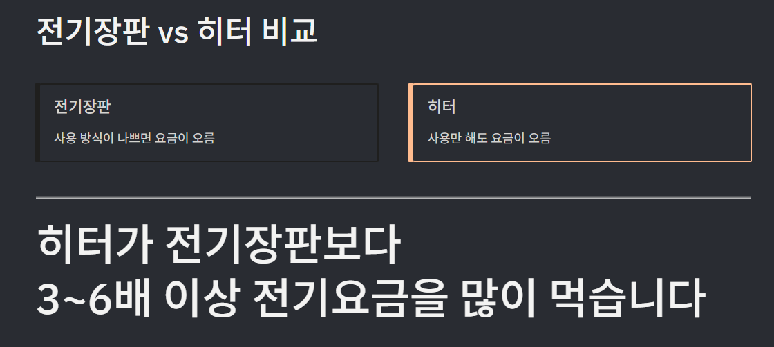 히터가 전기장판보다 3~6배 이상 전기요금을 많이 먹습니다.