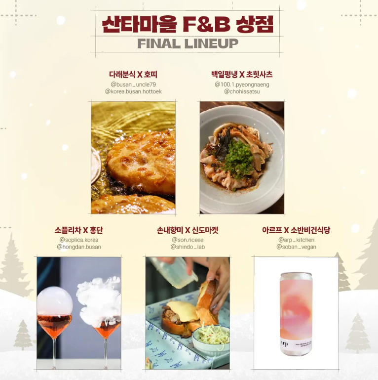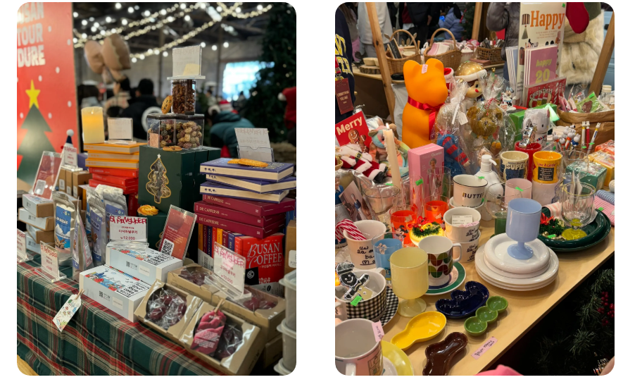 크리스마스 빌리지 부산은 150여 개 부산 로컬&인기 브랜드와 함께, 남쪽 임시 지점에 전 세계 음식, 크리스마스 한정 메뉴, 리빙·라이프스타일 기프트샵, 팝업스토어가 모인 부산 최대 규모 크리스마스 마켓입니다.