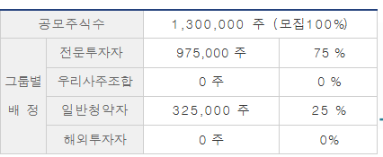 일반청약자 비중이 25%로 평균 수준입니다. 균등·비례 모두 승부가 가능하나, 경쟁률이 높아질 경우 체감 배정 주식수는 낮아질 수 있습니다.