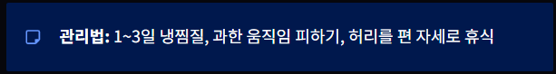 1~3일은 냉찜질, 과한 움직임 피하기, 허리를 편 자세로 휴식하기가 도움이 됩니다.