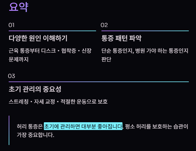 평소 스트레칭, 자세 교정, 적절한 운동으로 허리를 보호하는 것이 가장 중요합니다.