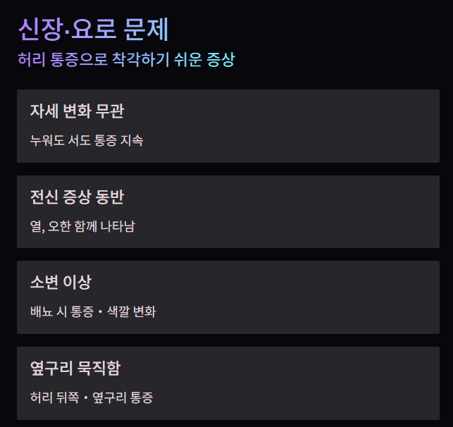 이 경우 허리가 아닌 **신장 문제(신장염, 결석)**일 수 있기 때문에 주의가 필요합니다.