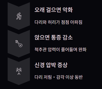 척추관이 좁아지면서 신경을 압박해 생기며, 갑작스럽게 통증이 악화되는 경우도 많습니다.