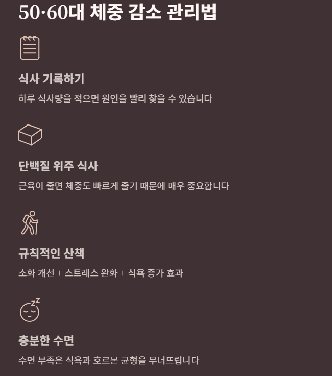 아래에서는 50·60대에게 흔히 나타나는 체중 감소 원인 7가지를 알기 쉽게 정리했습니다.