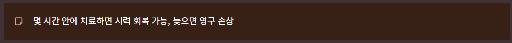 늦으면 영구적인 손상이 남을 수 있어 즉시 안과 응급진료가 필요합니다.