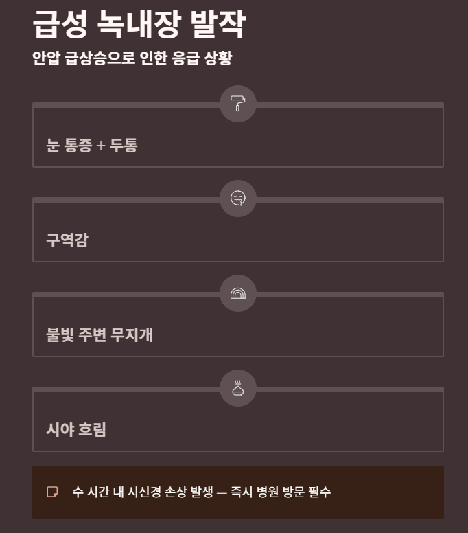 - 눈 통증 + 두통 + 시야 흐림