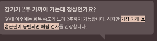 50대 이후에는 회복 속도가 느려 2주까지도 가능하지만, 기침·가래·호흡곤란이 동반되면 폐렴 검사를 권장합니다.