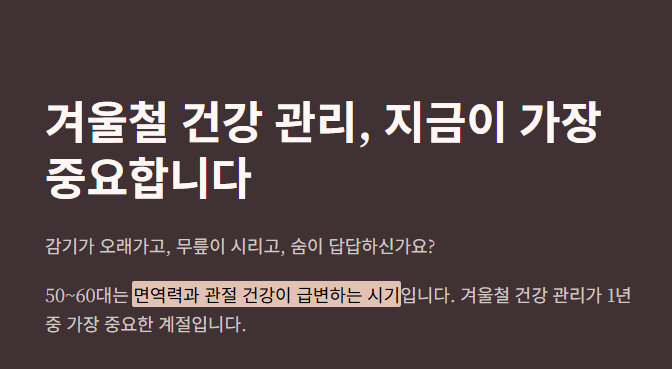 특히 50~60대는 면역력 변화와 관절 퇴행이 빠르게 진행되는 시기라 겨울철 건강 관리가 1년 중 가장 중요한 계절입니다.