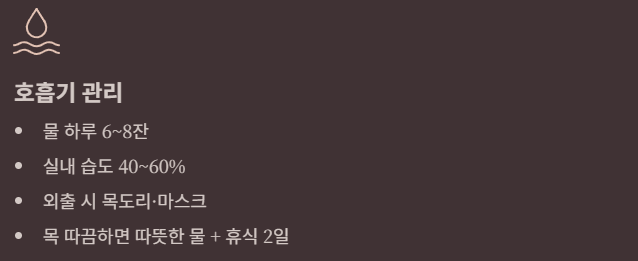 - 목이 따끔하면 따뜻한 수분 섭취 + 휴식 2일
