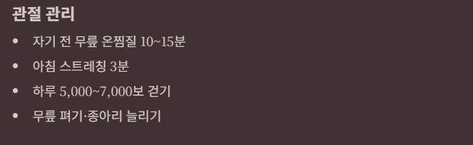 - 운동 부족 → 허벅지 근력 약화 → 무릎에 더 큰 하중