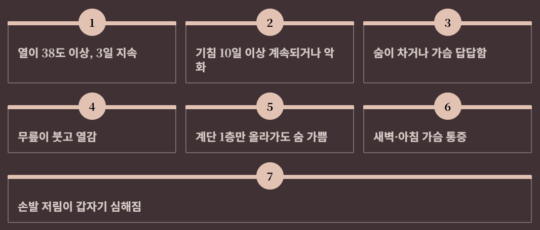 이 중 2개 이상 해당되면 즉시 내과·정형외과·호흡기내과 방문을 권장합니다.