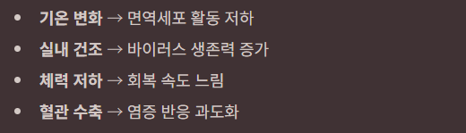 - 실내 난방으로 건조 → 바이러스 생존력 증가