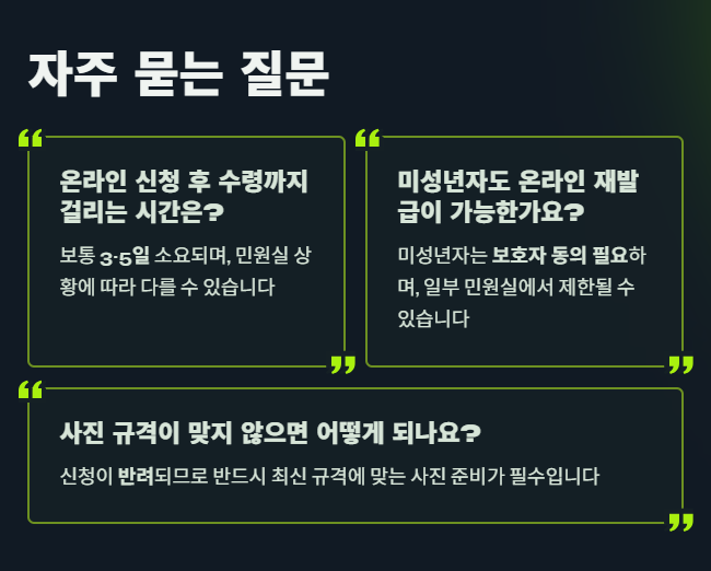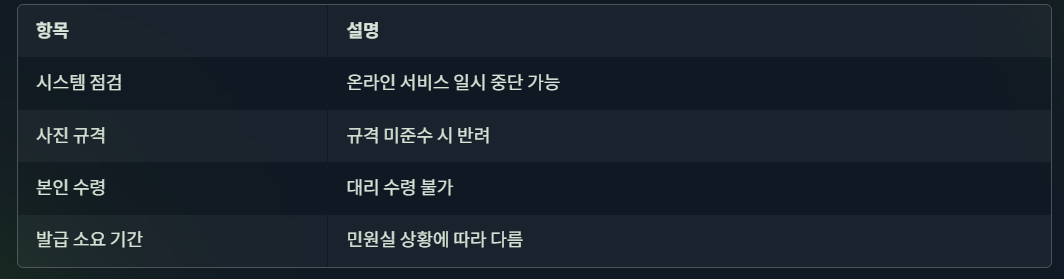 온라인 신청 후에는 반드시 본인이 민원실에서 수령해야 하며, 수수료와 소요 기간을 미리 확인해 계획을 세우는 것이 좋습니다.