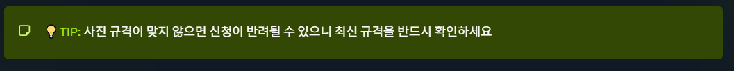 TIP: 사진 규격이 맞지 않으면 신청이 반려될 수 있으니, 반드시 최신 규격을 확인 후 업로드하세요.