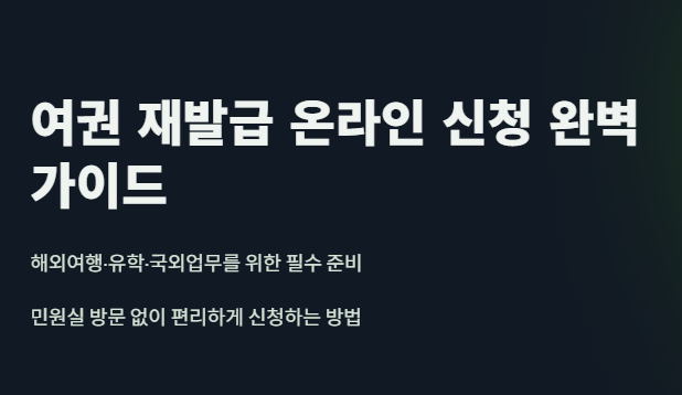 여권 재발급은 온라인으로 간편하게 신청할 수 있습니다. 바쁜 직장인이나 여행 준비자, 학생 모두 민원실 방문 부담 없이 신청이 가능하며, 준비물과 사진 규격만 주의하면 편리하게 이용할 수 있습니다.