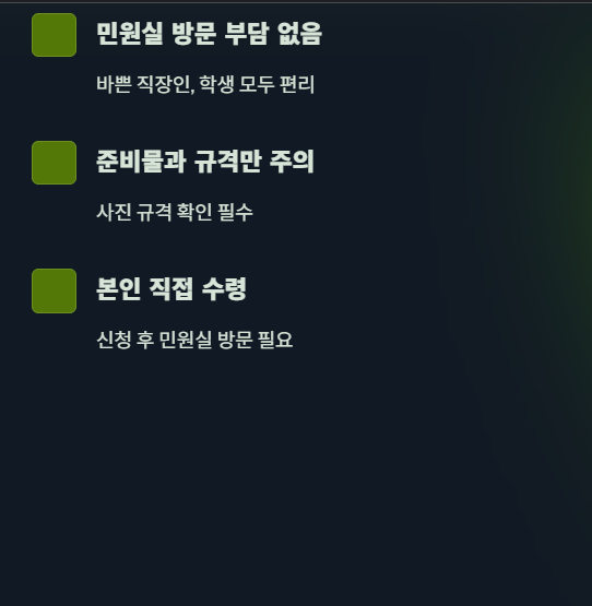 즉, 기존 여권이 없거나 구형 종이 여권만 있는 경우에는 온라인 신청이 불가하며, 반드시 민원실을 방문해야 합니다.