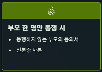 - 동행하지 않는 부모의 동의서 + 신분증 사본