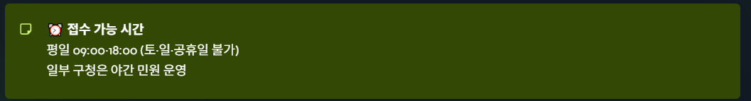 - 토/일/공휴일 접수 불가 (단, 일부 구청 야간 민원 있음)