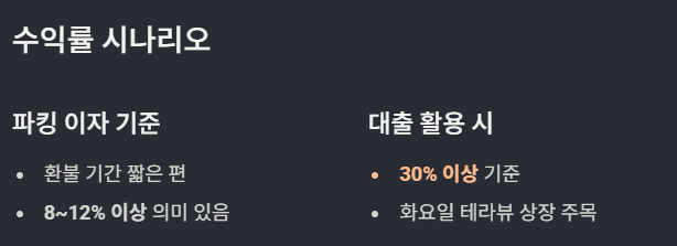 - 환불 기간은 짧은 편이라 → 파킹이자 기준 8~12% 이상이면 의미 있음