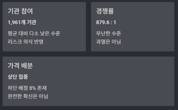 - 1,961 기관이 참여하여 최근 IPO 평균(2,000곳 이상) 대비보다는 다소 낮은 편입니다.