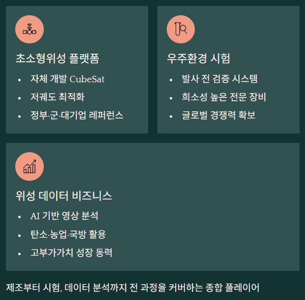 | 나라스페이스 | 초소형위성 + 시험 + 데이터 | 100억+ | 종합 사업 구조, 기술 확장성 |