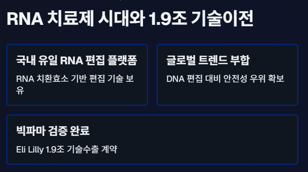 DNA 편집보다 오류 복구가 용이하고, 글로벌 빅파마들도 RNA 편집 관련 딜을 공격적으로 체결하며 기술 안정성을 이미 인정하고 있음.
