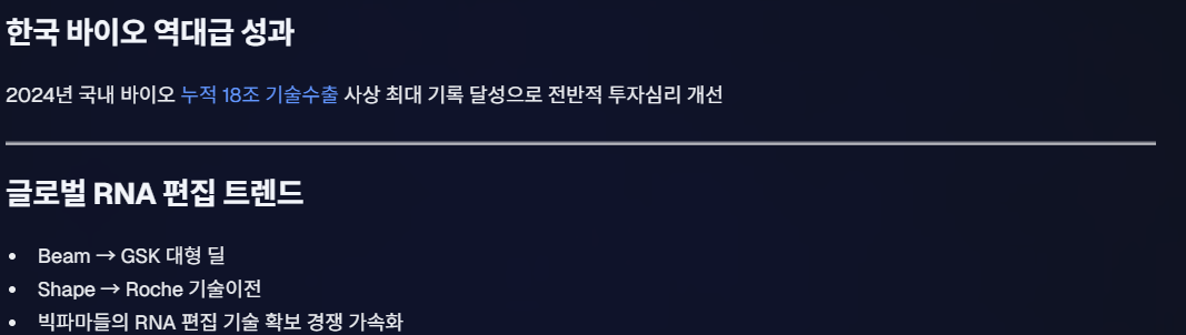 - 글로벌 바이오 시장에서는 최근 “DNA 편집보다 RNA 편집”이 안전성 면에서 더 주목받고 있다.