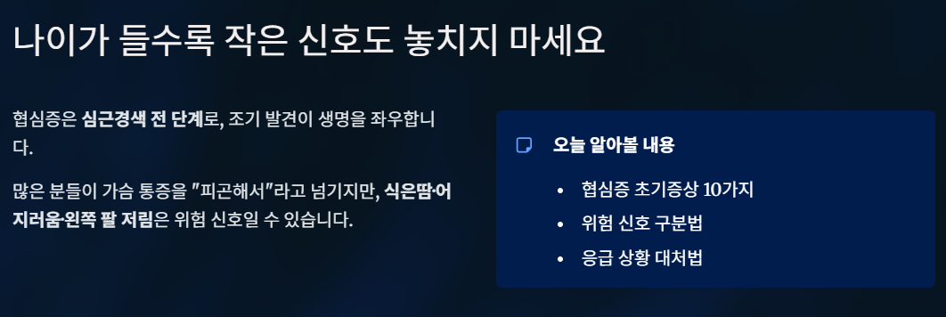 나이가 들수록 몸에서 보내는 작은 신호 하나도 그냥 지나치면 안 됩니다. 특히 협심증은 심근경색 전 단계로, 조기 발견 여부에 따라 생명과 직결되기도 합니다.