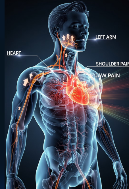 가슴 통증이 왼쪽 팔 안쪽, 어깨, 턱으로 뻗어나가는 형태라면 위험 신호입니다.