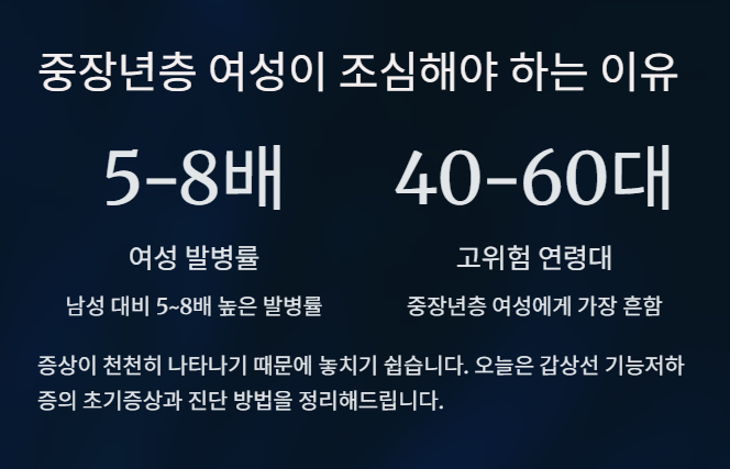 특히 40~60대 여성은 남성보다 5~8배 이상 발병률이 높고, 증상이 천천히 나타나기 때문에 놓치기 쉽다.