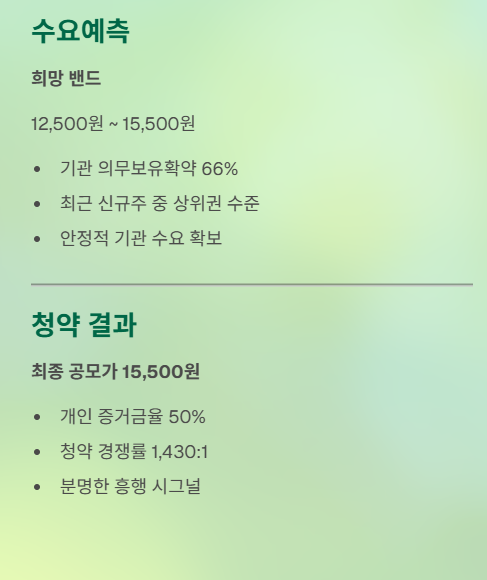 청약자 입장에서는 “소형·가벼운 공모주 + 경쟁률 괜찮음 + 확약 중간 이상” 조합으로, 상장일 흐름을 기대할 수 있는 구성입니다.