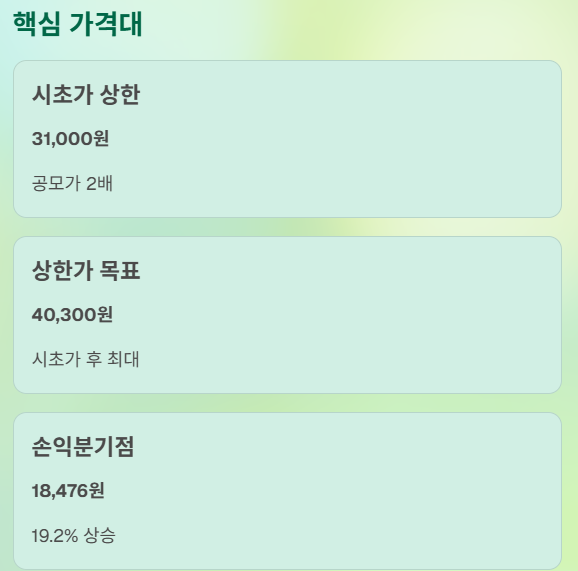 - 시초가 상한(공모가 2배): 31,000원