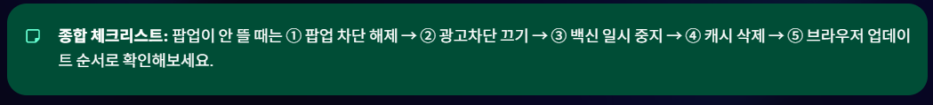 팝업 차단을 해제했는데도 안 뜬다면 아래 원인이 많다.