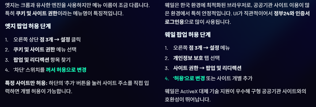 웨일은 UI가 안정적이라 정부24·인증서 로그인용으로 많이 사용된다.