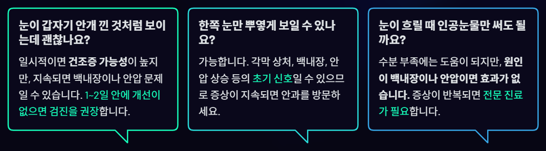 일시적이면 건조증 가능성이 높지만, 지속되면 백내장·안압 문제일 수 있다. 1~2일 안에 개선이 없으면 검진 권장.