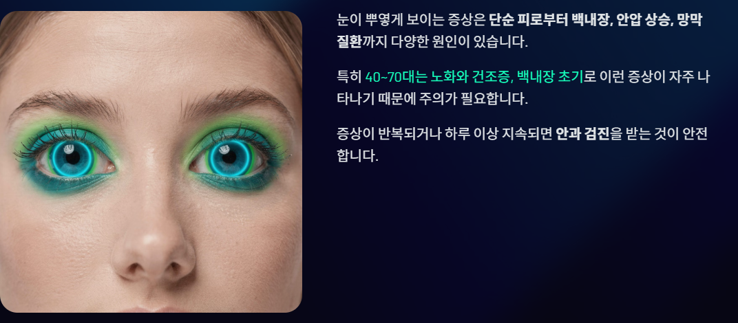 → “눈앞이 뿌옇고, 무겁고, 두통·눈 통증”이 함께 올 수 있다.