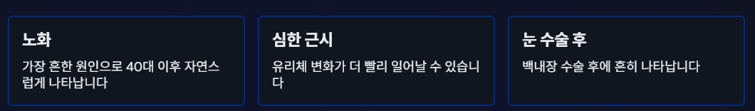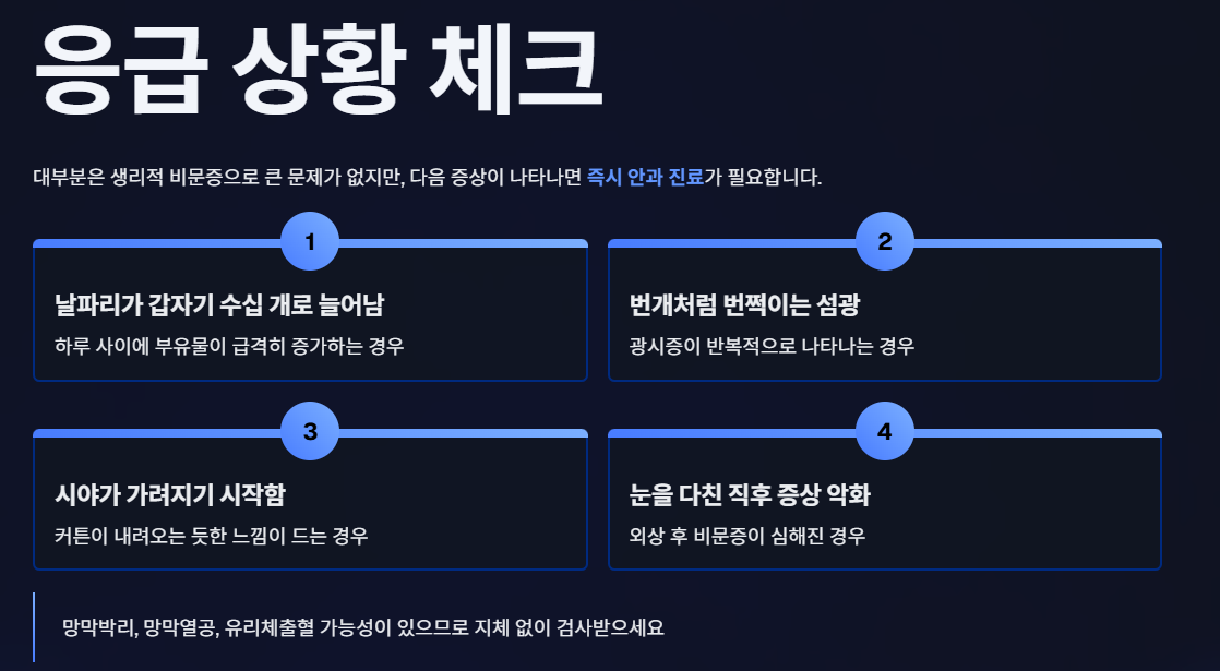 단, 섬광 + 날파리 급증은 망막박리 위험이 있어 즉시 진료 필요.