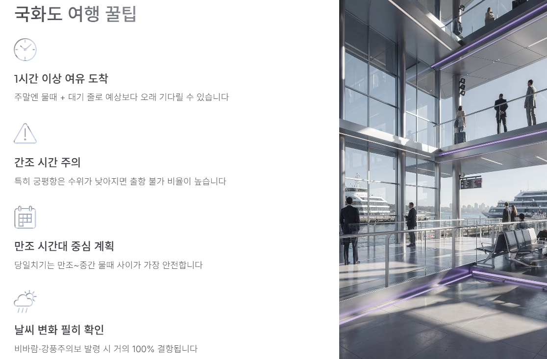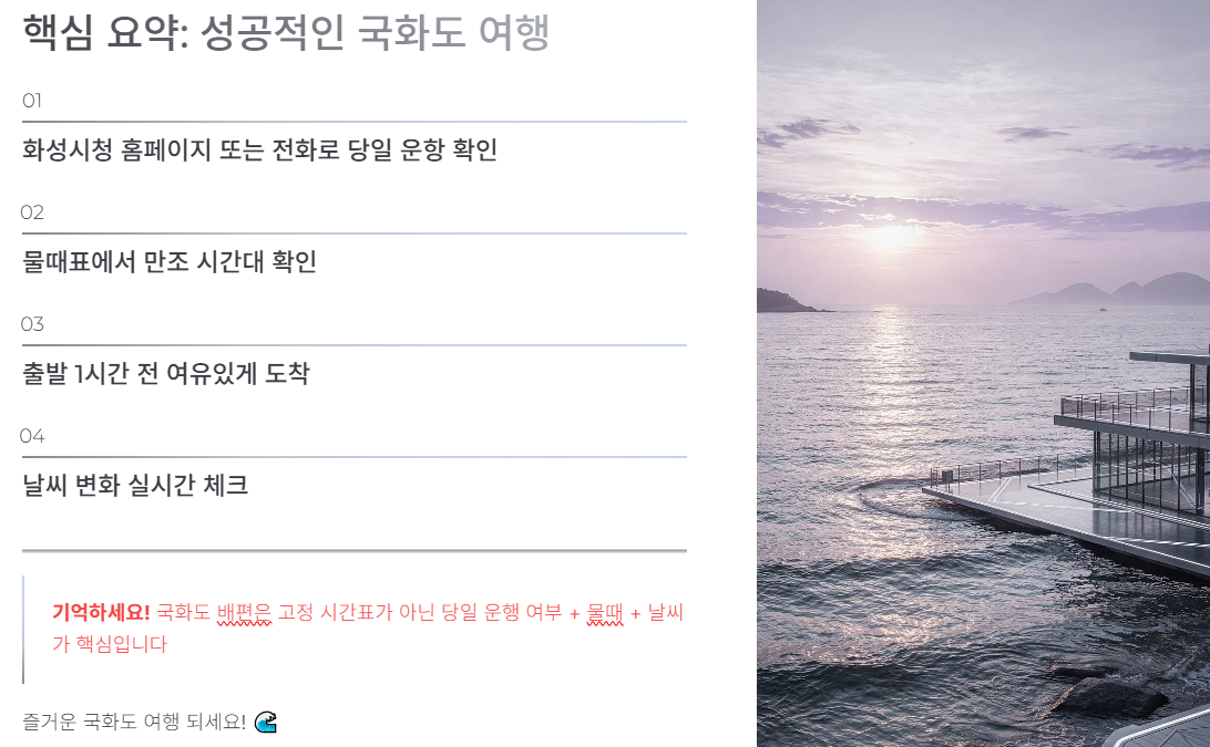 최근 들어 도심에서 벗어나 조용한 힐링을 찾는 분들이 많아졌습니다. 저 역시 주말을 이용해 바다를 느끼고 싶어 국화도를 찾았는데, 직접 다녀온 경험을 바탕으로 교통 정보, 배시간표, 볼거
