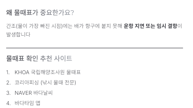 따라서 고정 배시간표보다 “당일 가능한 출항 시간 + 물때표 + 실시간 확인”이 핵심이다.
