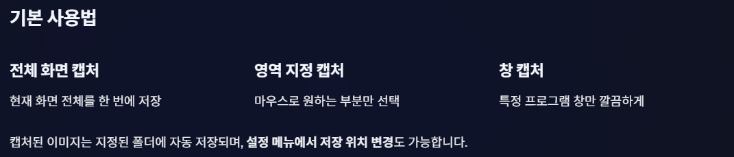 - 영역 지정 캡처: 마우스로 원하는 부분만 선택해 캡처할 수 있습니다.